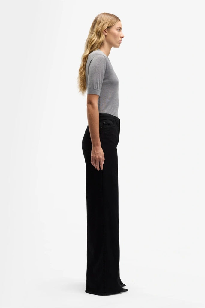 Pasvorm: een hoog uitgesneden broek met wijde pijpen en een lang silhouet dat vloeiend overgaat van de taille naar de benen voor een stoere maar toch relaxte look.