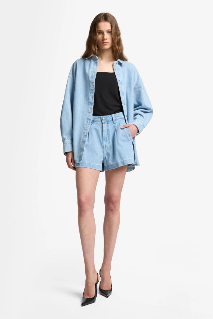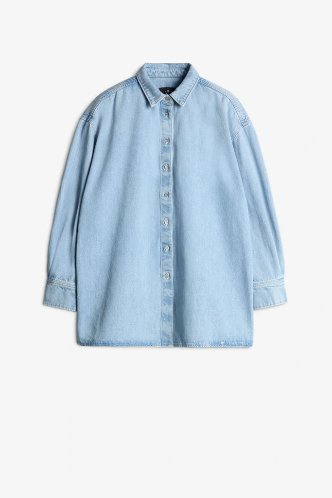 Het Nina Overshirt is moeiteloos cool en wordt gedefinieerd door een overdreven, oversized pasvorm. Het is gemaakt van lichtblauw Mankind-denim en gedetailleerd met een puntkraag en knoopsluiting en manchetten. Speel met proporties door het te combineren met bijpassende shorts en een leren jack. -
