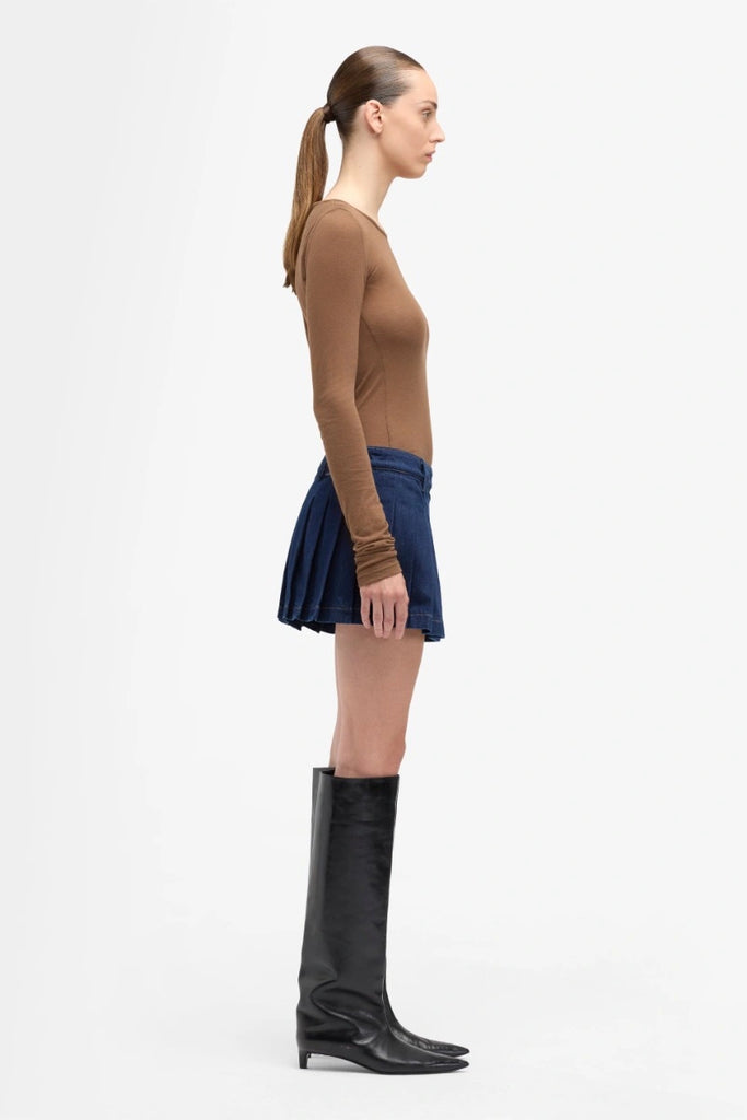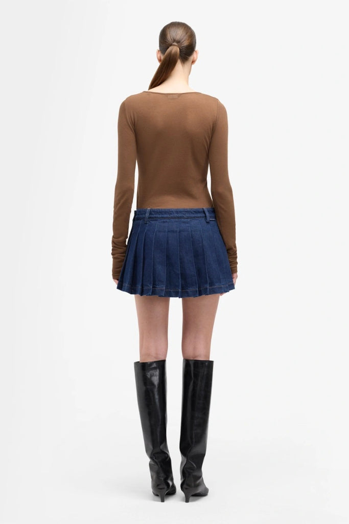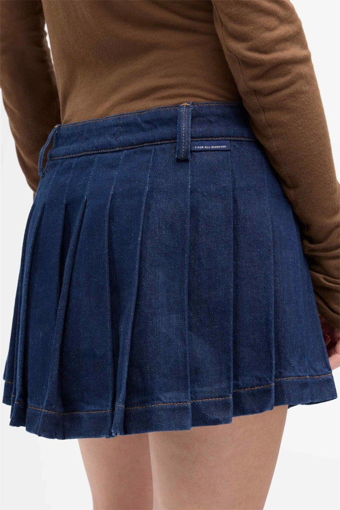 Pasvorm: zit op de natuurlijke taille met scherpe plooien die uitlopen in een silhouet dat tot op de dijen valt.